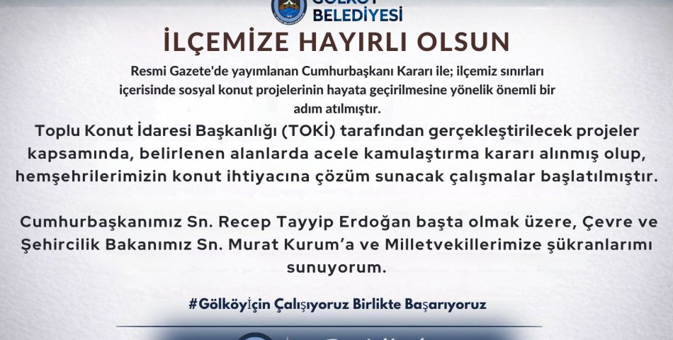 Resmî Gazete’de yayımlanan Cumhurbaşkanı Kararı ile Ordu’nun Gölköy ilçesinde sosyal konut projelerinin hayata geçirilmesine yönelik önemli bir süreç başlatıldı.